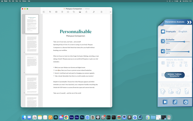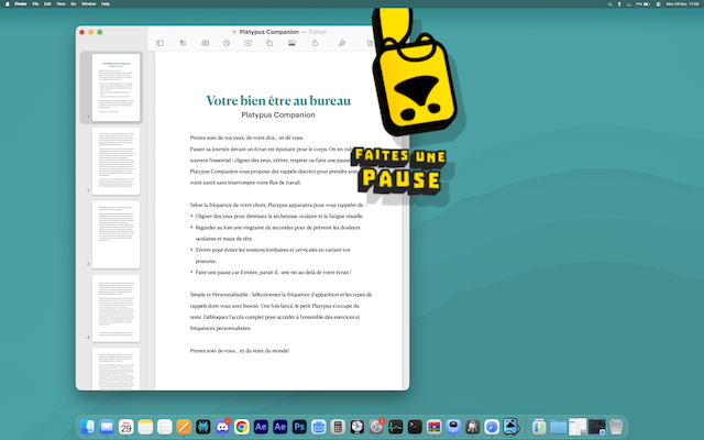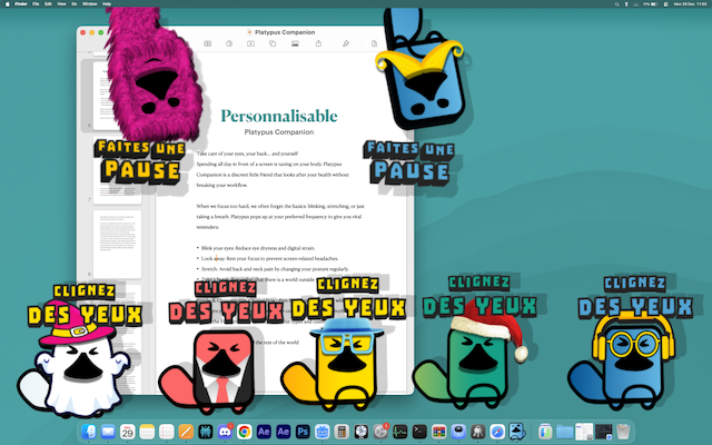 Quand nous sommes concentrés devant notre écran, nous oublions l'essentiel : cligner des yeux pour éviter la fatigue visuelle, s'étirer pour soulager son dos, ou simplement respirer. Platypus intervient au bon moment pour vous rappeler ces gestes simples par une animation courte qui n'interrompt pas votre session de travail .